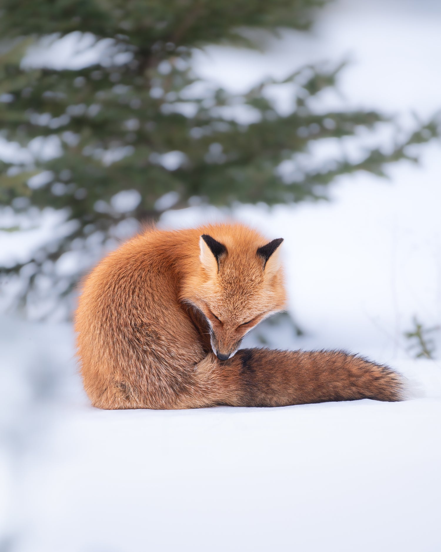 En arrivant à mon spot, j’ai marché 5-10 minutes quand il est apparu, tout juste à côté de moi. Il s’est assis et est resté ainsi juste assez longtemps pour que je puisse prendre quelques clichés avant de repartir tranquillement. Je suis resté quelques minutes de plus pour ne pas le déranger, puis j’ai repris ma marche. À peine quelques mètres plus loin, je l’ai revu dans un champ. Il était immobile et semblait très intéressé par la neige devant lui. Je savais ce qui allait se passer, car j’avais déjà eu la chance d’observer un comportement similaire chez un autre renard. J’ai donc rapidement ajusté les paramètres de mon appareil pour capter la scène d’action qui allait suivre, et BOOM; le renard s’est projeté dans les airs pour attraper une souris qui se trouvait sous la neige. Je n’en croyais pas mes yeux et j’étais même certain d’avoir manqué la photo. Les conditions de faible luminosité, le fait que je n’avais pas photographié depuis quelques années, et le fait que je n’étais pas encore habitué à mon nouvel appareil photo m’ont vraiment fait douter de ma capacité à capturer une scène aussi exigeante sur le plan technique. J’ai donc immédiatement vérifié si j’avais réussi l’exploit, et à mon grand bonheur, c’était bien le cas.