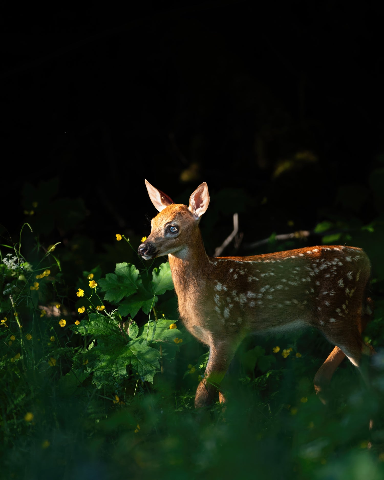 Une fois les mâles disparus dans le boisé, je me suis remis à la recherche d'un faon à photographier. À peine plus loin, j'en aperçois déjà un ! Il se trouvait à l'orée du bois, et la douce lumière du soleil venait lui donner une teinte chaleureuse. J'en ai donc profité pour réaliser une image de type "Low-key", c'est-à-dire en sous-exposant ma photo volontairement afin d'avoir un arrière-plan noir qui mette le sujet en valeur.