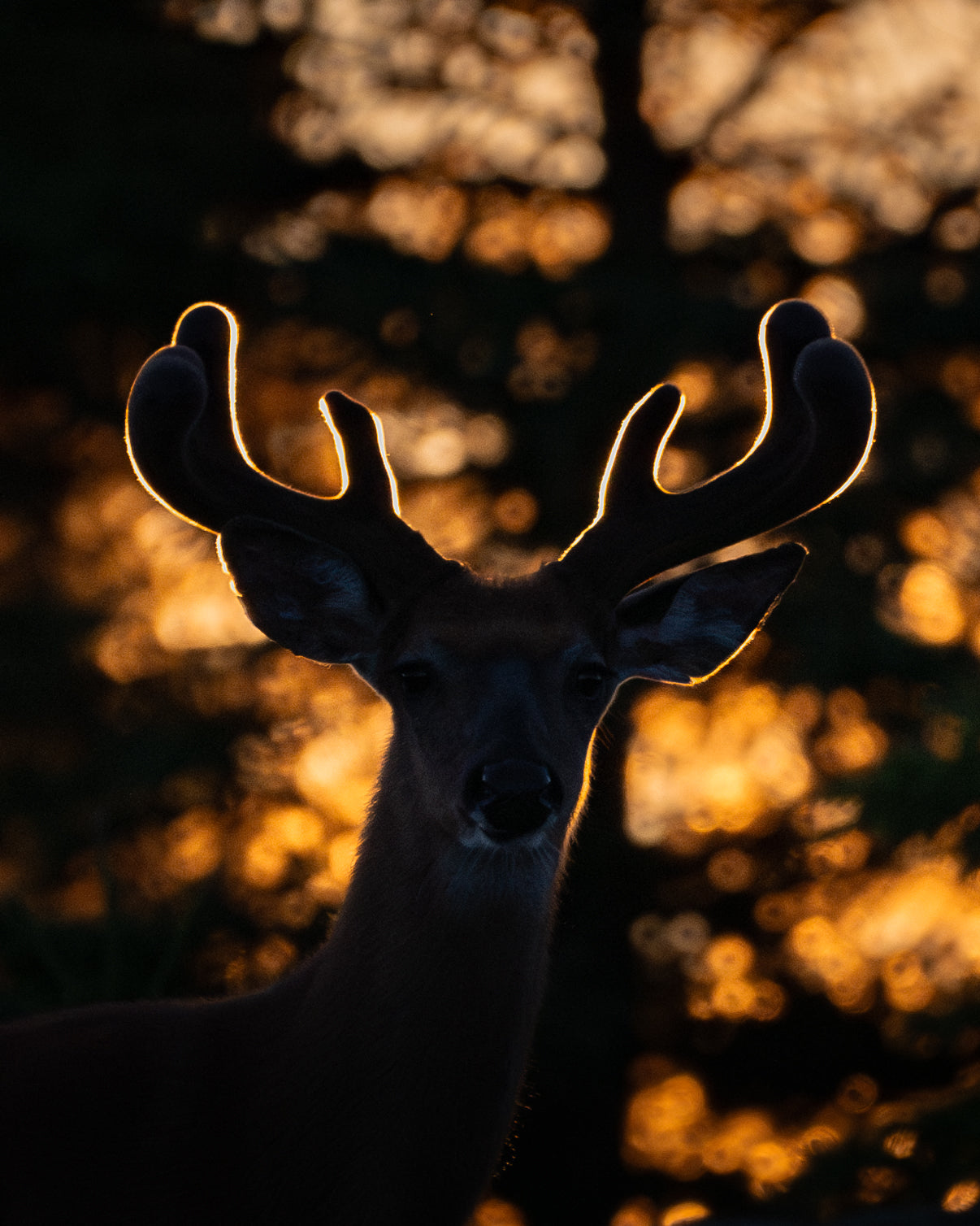 Celui qui menait le groupe était particulièrement énorme, je l'ai surnommé Colosse. Je me souviens m'être donné la mission de le rephotographier lorsque ses bois seraient pleinement développés, quelques mois plus tard. Les cervidés sont ensuite passés près de moi pour finalement se placer à contre-jour, et j'ai pu capter une image de la silhouette de Colosse à contre-jour. On pouvait voir que ses bois avaient encore beaucoup de croissance à faire, juste par l'immensité des boules au bout de ses pointes.