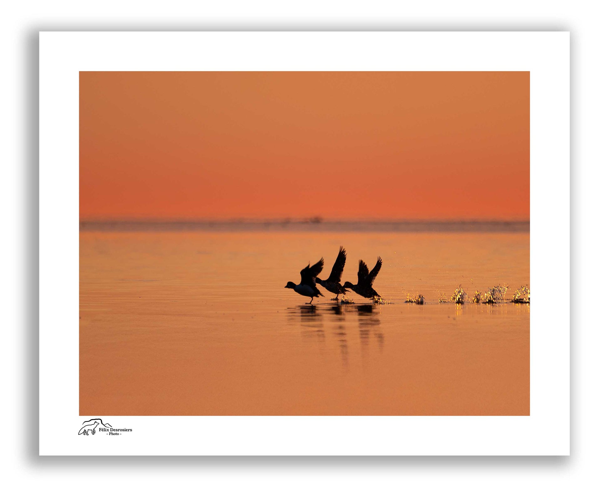 Un groupe de canards qui s'envolent à la vue d'un phoque qui s'approchait un peu trop à leur goût, avec les chaudes couleurs d'un levé de soleil au parc du Bic en arrière plan.